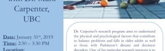 Dr. Carpenter's research program aims to understand the physical and psychological factors that contribute to balance problems and falls in older adults as well as those with Parkinson’s disease and dizziness disorders. One of his particular research interests is to better understand how fear of falling and reduced balance confidence contribute to balance problems. He uses novel methods to alter individuals' anxiety and fear to investigate how these changes may directly impact different components of balance control. He will discuss how changes in sensori-motor function and cognition may contribute to fear-related balance changes and the potential implications for diagnosis, treatment and prevention of balance deficits and falls.